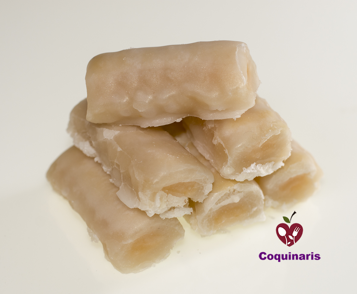 Hacemos rulitos con el mazapán y cortamos bastones, a los cuales le pasamos el rodillo hasta dejarlos a 3 mm de grosor más o menos y cuadrados de 5 cm más o menos (tampoco hace falta regla) lo hacemos a ojo.